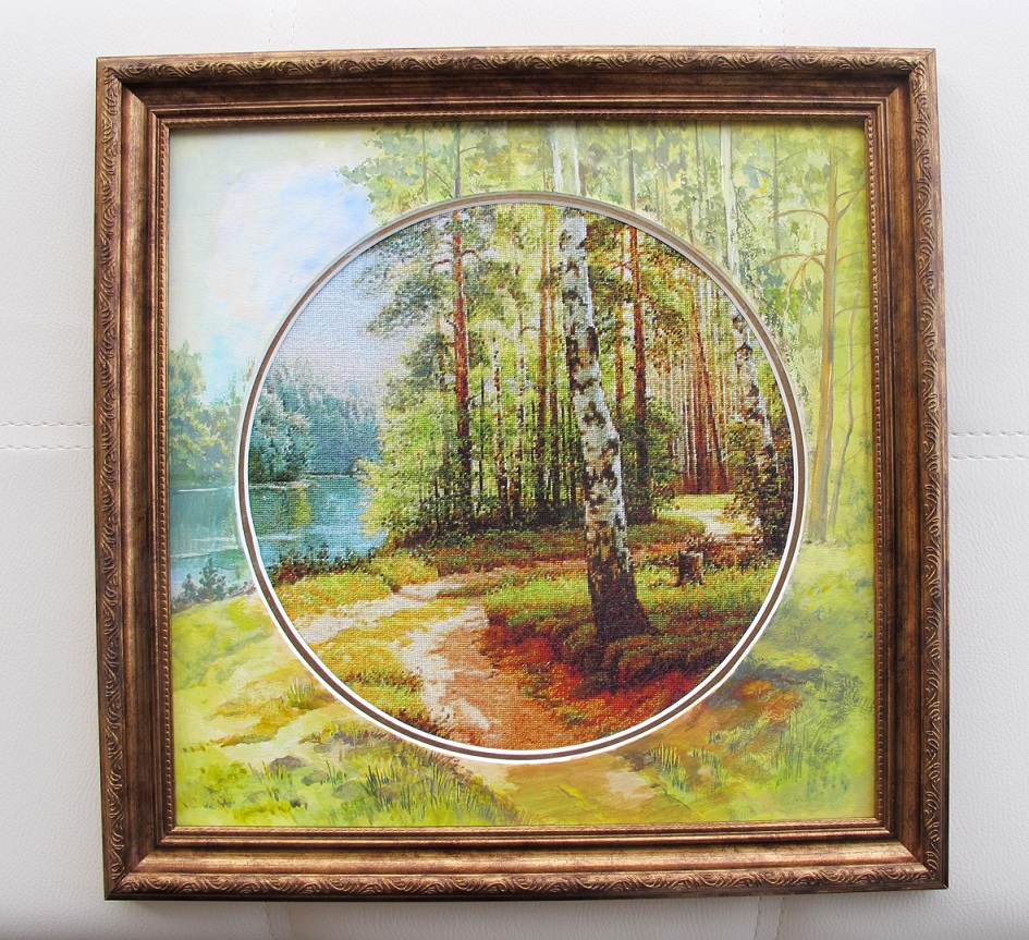 Ой, девочки! Это какая-то жесть! Сейчас расскажу историю оформления моего кружочка. Сначала мне прислали эскиз После моего недоумения сделали другой После моего гневного письма мне предложили эскиз Не идеальный, конечно, но все-таки значительно лучше. Я дала добро, мне весело звонят и сообщают, что все готово. Я на крыльях счастья лечу в багетку и вижу... У меня так и не было возможности сфотать то, что там было. Во всяком случае к эскизу оно не имело никакого отношения. Чтобы хоть немного показать этот ужас, я сама немного намалякала. Ни о какой сосне в дорисовке справа речи вообще не шло. Ну ладно. Особенно меня порадовала ровная по линейке линия листвы на фоне неба, дорожка, которая резко закончилась и превратилась в нечто зеленое, и четкий край дорисованной части, не доходящий до багета. Т.е., по представлениям художницы, оформление, типа такого (т.е. вышивка-рисунок и потом кусок недокрашенного холста - это норм) Я попросила доделать. Дело было в пятницу вечером. В пн мне сообщили, что не могут дозвониться до художницы. Я забрала вышивку и отдала другому. Сегодня отнесла обратно, чтобы вставили в багет. Знаете что мне сказали? 1) Было лучше 2) Каждый видит по своему (ну, не спорю, но покажите мне хоть одного человека, который видит оформление так: вышил или нарисовал, оставил по краям по 1 см незашитой канвы или пустого холста и так в багет засунул) 3) Художница свое дело сделала, докушивайте, уплочено... Ну и все в этом духе. Потом дальше. Вот смотрю я а то, что получилось и мне кажется, что паспарту несколько широковато, что забивает оно вышивку не яркостью дорисовки (тут все норм, дорисовка чуть бледнее самой вышивки), а именно размером. Говорю, что паспарту широковатое. На что они мне "как просили". Начали поднимать документы и мерить. Я просила 3см, сделали 4см. Ну, действительно, какая разница? Надеюсь они хоть поставят тот багет, который я просила. ВОТ! Наташа я...