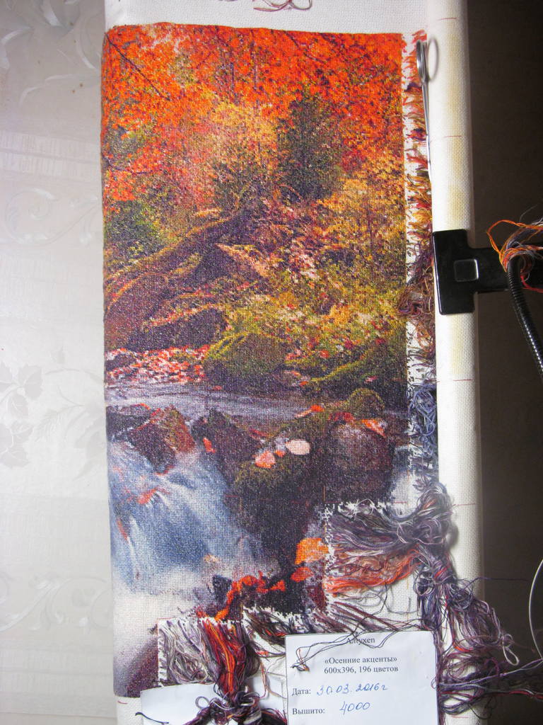 | Да, пейзаж не из легких, и это мягко сказано.... Но когда завершится этот процес, Вам, Лена, будет "нипочем" любой сложности работа. Цветовая гамма умопомрачительная, четко видно каждую веточку, каждый сучок.... И сколько деталей - листва, вода, камни, мох... Скорейшего завершения Вам, и удовольствия от этой работы