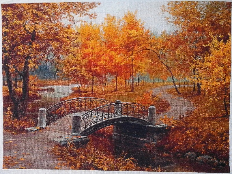 | Спасибо всем за внимание к моей вышивке. Как-то даже жалко, что все уже закончилось. Когда вышиваешь хочется побыстрее закончить, а закончив начинаешь скучать, ведь уже все вышито и ничего уже не изменится. Вышивка получилась очень красивой, мне очень нравится полученный результат. Тот кто будет вышивать этот дизайн пусть имеет в виду, что вышивка сложная, но результат потрясающий. Деревья такие настоящие, мостик очень красивый и дорожка уводит вдаль наверное к чему-то очень хорошему (хочется в это верить).