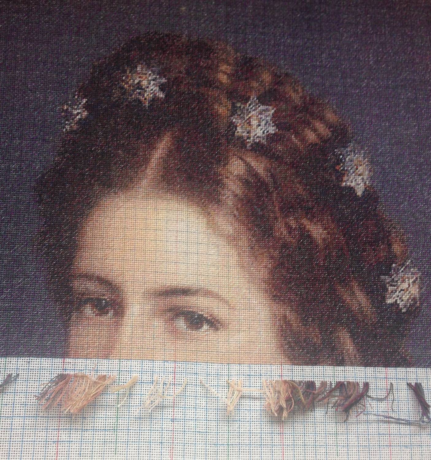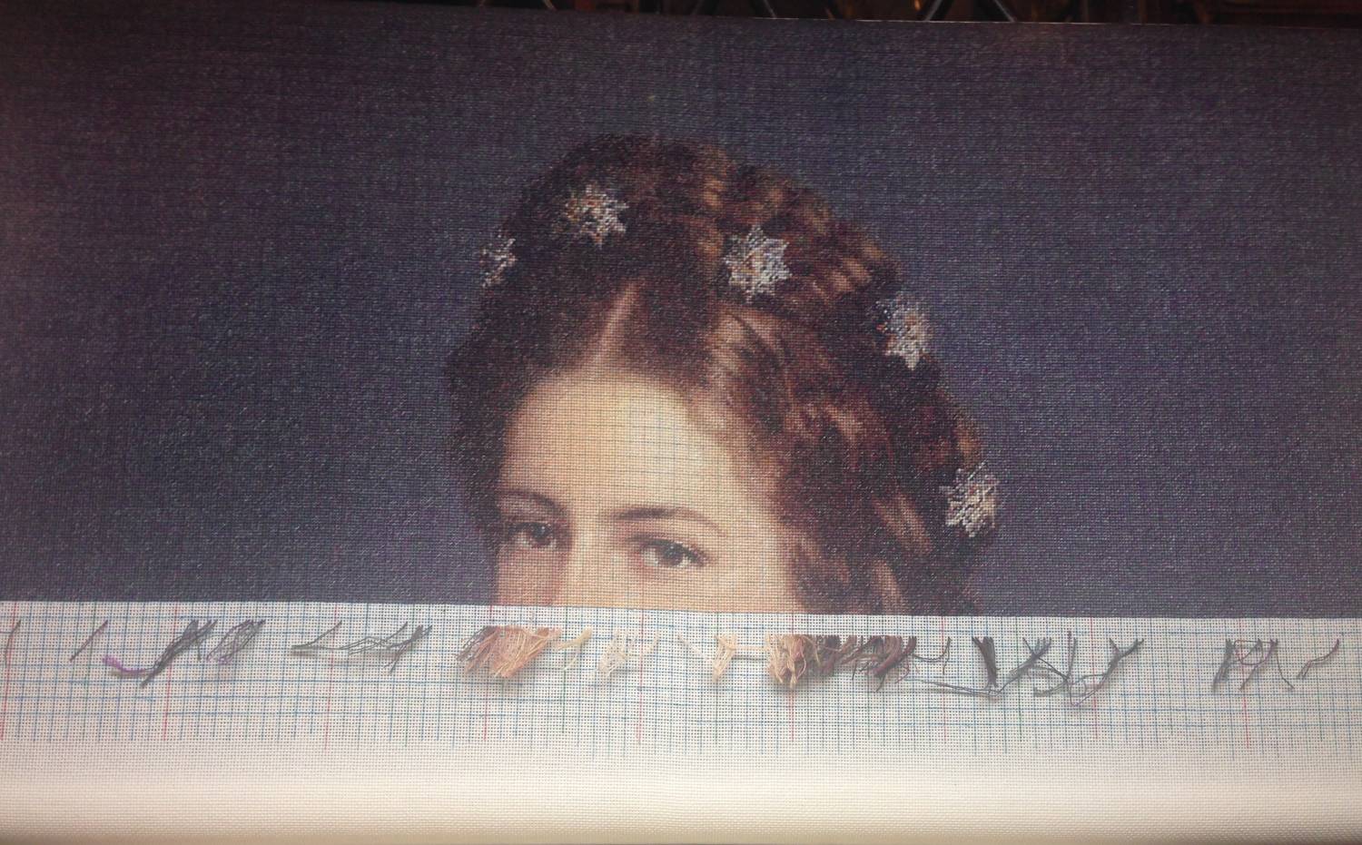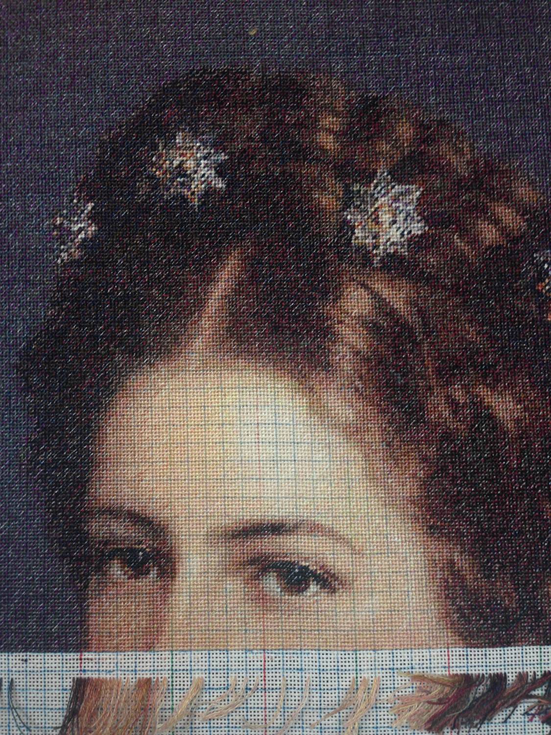 rasenta, НаДиМа, talla007, Inesssa, larissa28, девочки, спасибо за добрые слова! Отшито 30 листов из 90. Вышивается легко, на фоне даже скучновато. Что касается взгляда, то даже удивительно, как из смешения ниток и стежков возникает ощущение живых глаз. Все, кто видел наяву, так и говорят. Довольно сложно вышиваются звездочки в волосах, сплошные одиночки. Но таких участков немного. Ирина