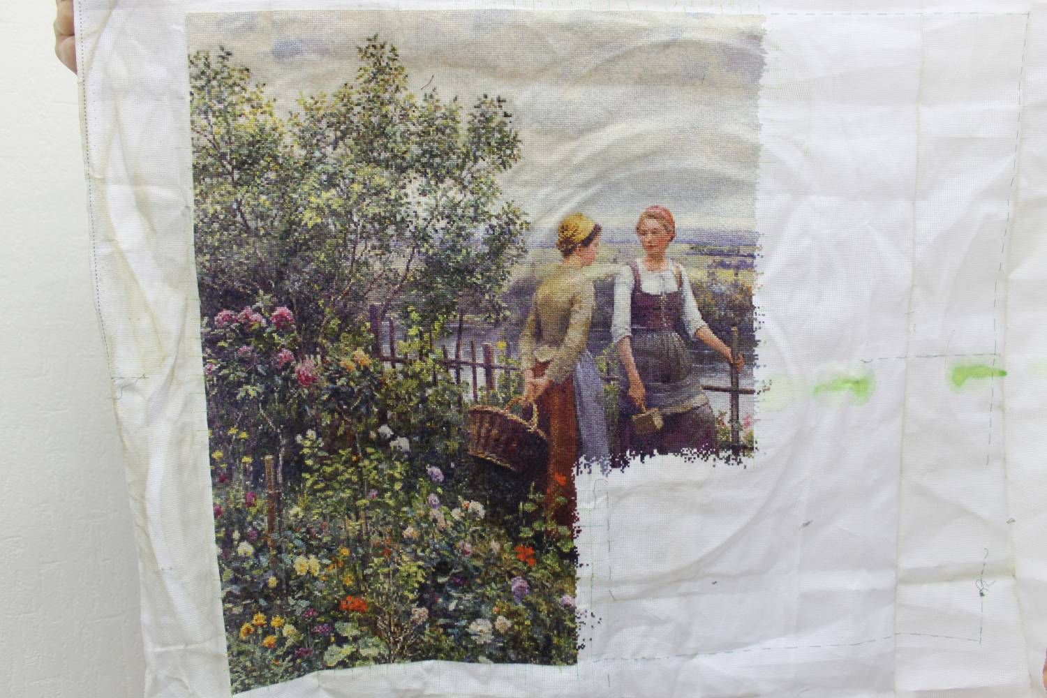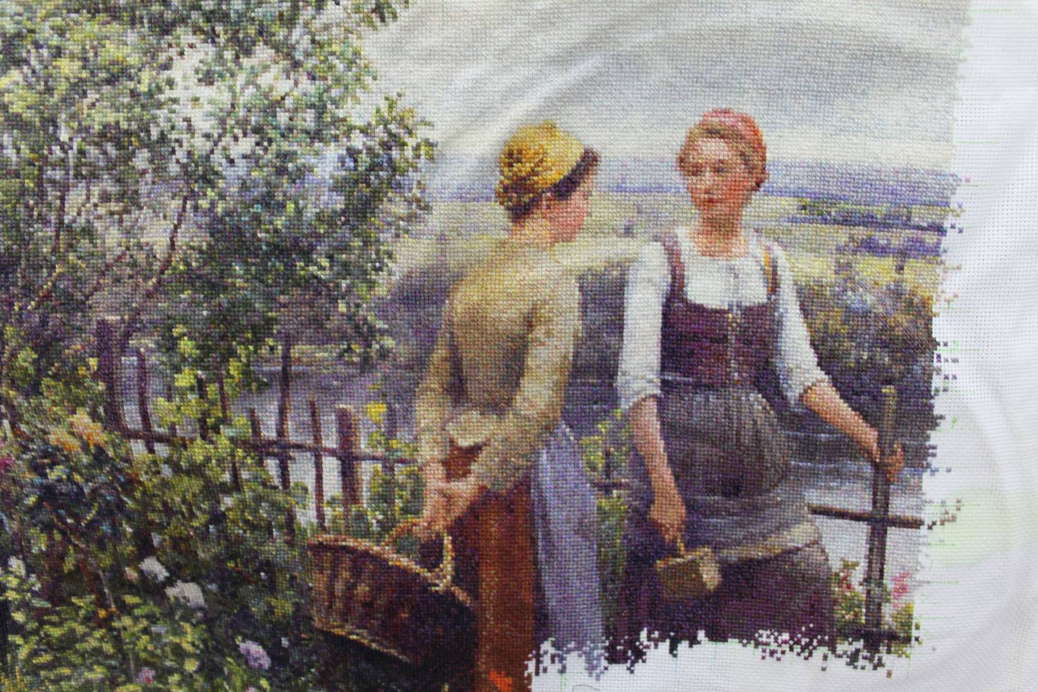 | Я пошутила, наверное девушки разговаривают о своих кавалерах, поэтому и раскраснелись. А Клавдия Дмитриевна не хочет распарывать, потому что вышивка не из легких, ей сложно. Я бы для себя переделала. Не подумайте, что у меня какие то претензии к разработке Лены. Совершенно нет. Совпадение со скрином отличное. Больше скажу, когда я увидела вышитую часть картины, я ахнула от неожиданности, так мне понравился результат!